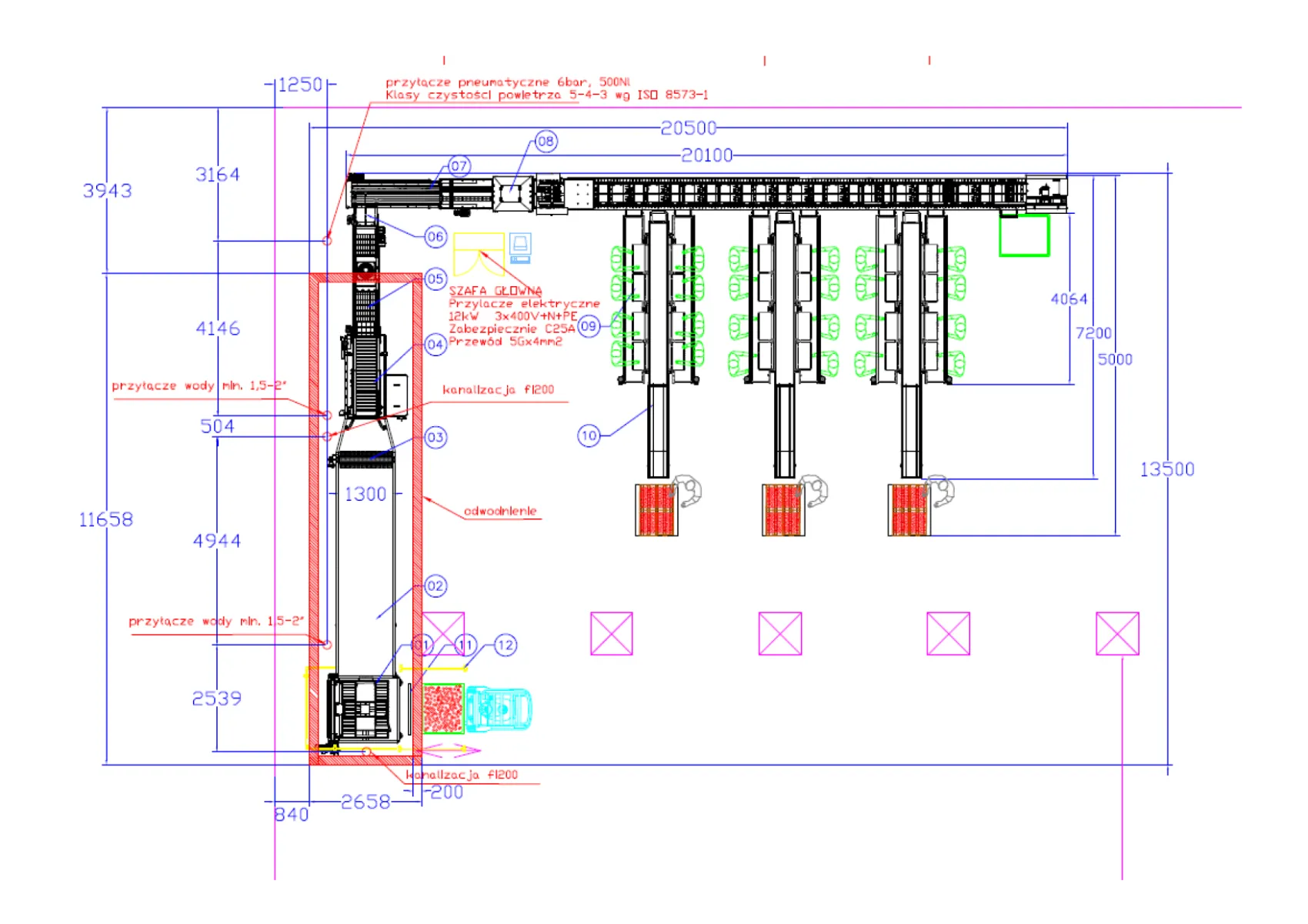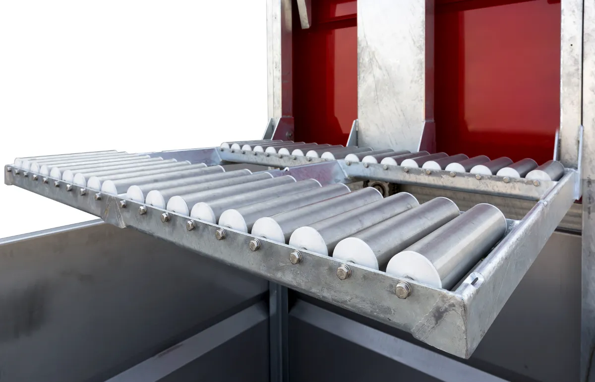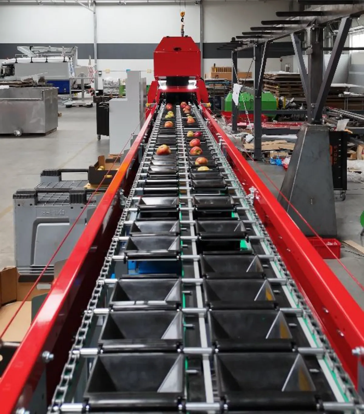 Equipos adicionales como: mesas de embalaje, llenadoras, caída de cajas, transportador central para recepción clase II, robot de descarga, alimentador de cajas y paletas tipo PPA-L con empujador y transportador de rodillos por gravedad PRR para descarga